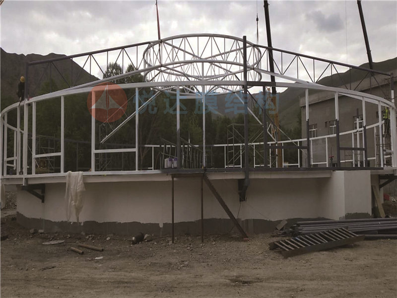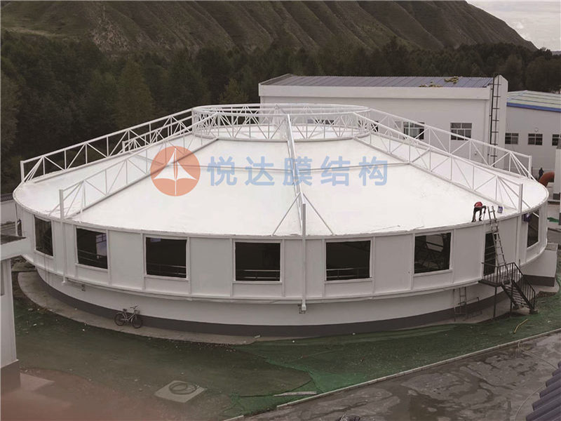 该项目是宁波众茂杭州湾热电废水池加盖膜结构工程,采用加高钢架反吊膜,此方案是常用于污水池加盖密闭的一种膜结构形式,采用的是环境工程专用膜材,钢结构再外面将膜反吊,这样既发挥了膜材的抗腐蚀性,又从根本上解决了钢结构与腐蚀性气体接触而带来的腐蚀问题,因而钢结构可以按普通建筑钢结构的防腐等级考虑进行设计,具有50年的使用寿命,发挥了钢结构的性能,实现了结构骨架与覆盖材料的完美结合。该工程现以竣工,并得到了该业主的一致好评。