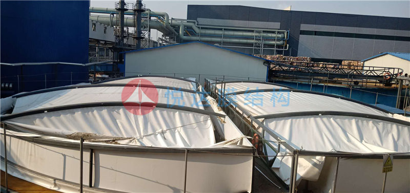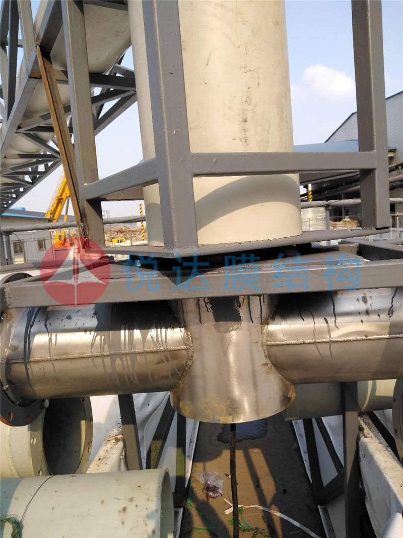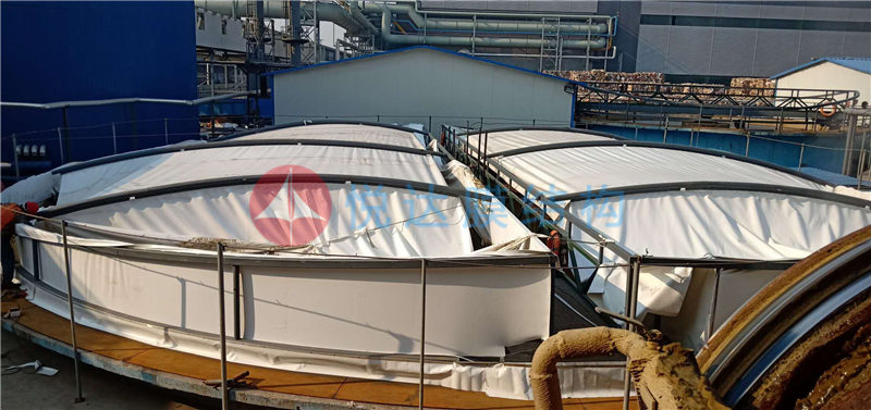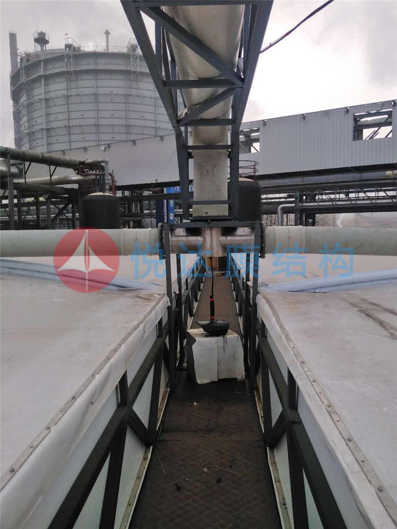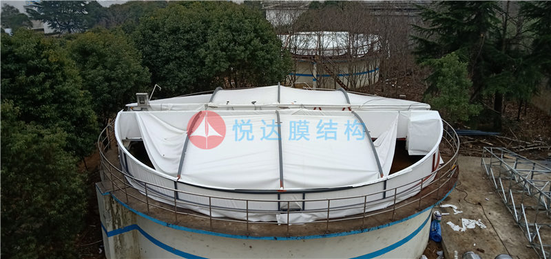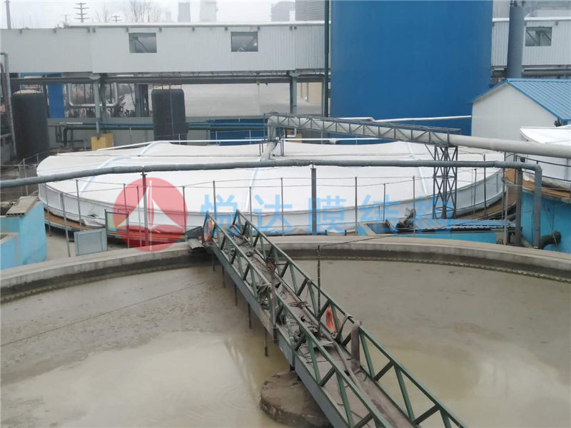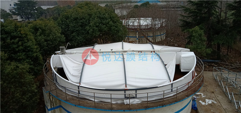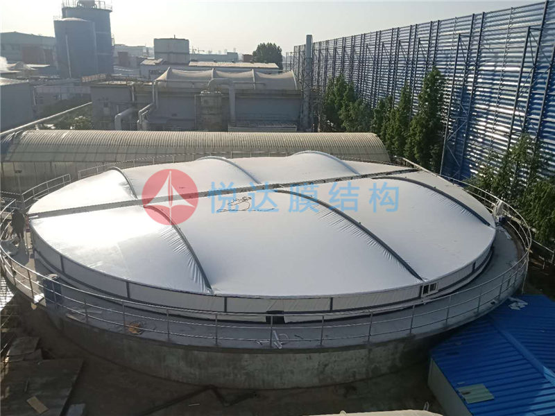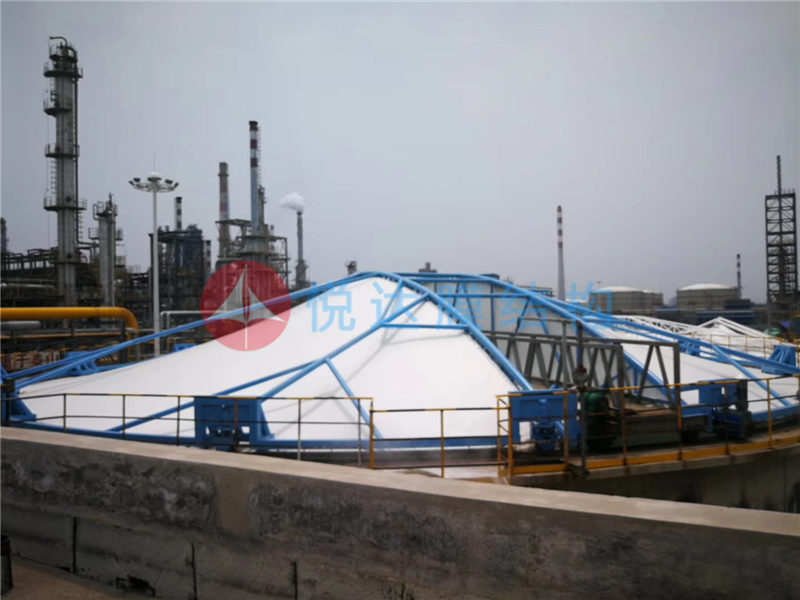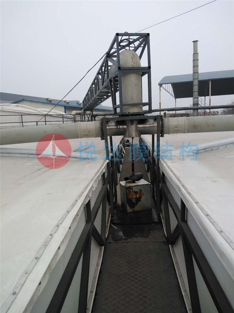 该项目是寿光鲁丽集团随动式污水池膜结构工程,采用加高钢架反吊膜,此方案是常用于污水池加盖密闭、并随着池体旋转,采用的是环境工程专用膜材,钢结构再外面将膜反吊,这样既发挥了膜材的抗腐蚀性,又从根本上解决了钢结构与腐蚀性气体接触而带来的腐蚀问题,因而钢结构可以按普通建筑钢结构的防腐等级考虑进行设计,具有50年的使用寿命,发挥了钢结构的性能,实现了结构骨架与覆盖材料的完美结合。该工程现以竣工,并得到了该业主的一致好评。