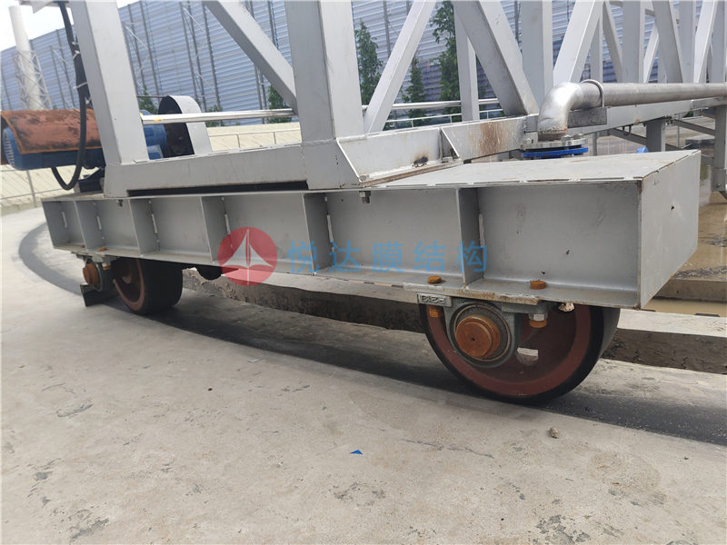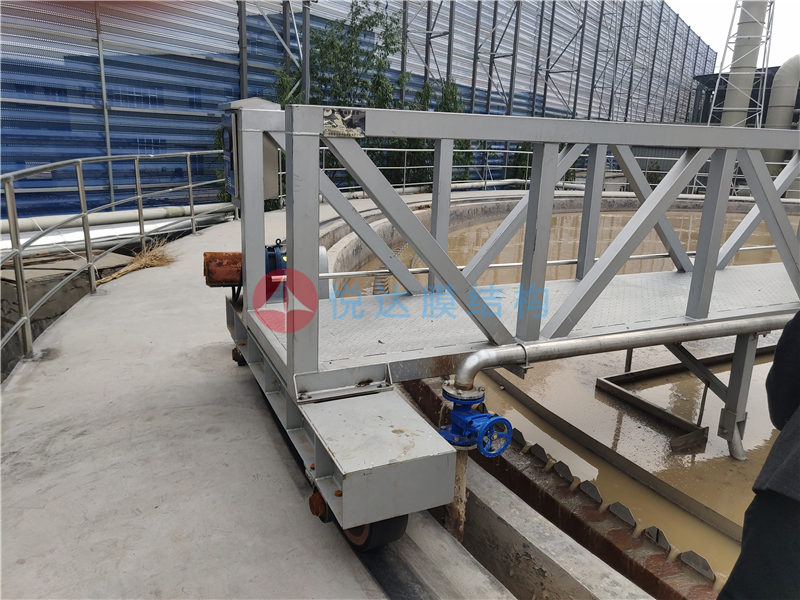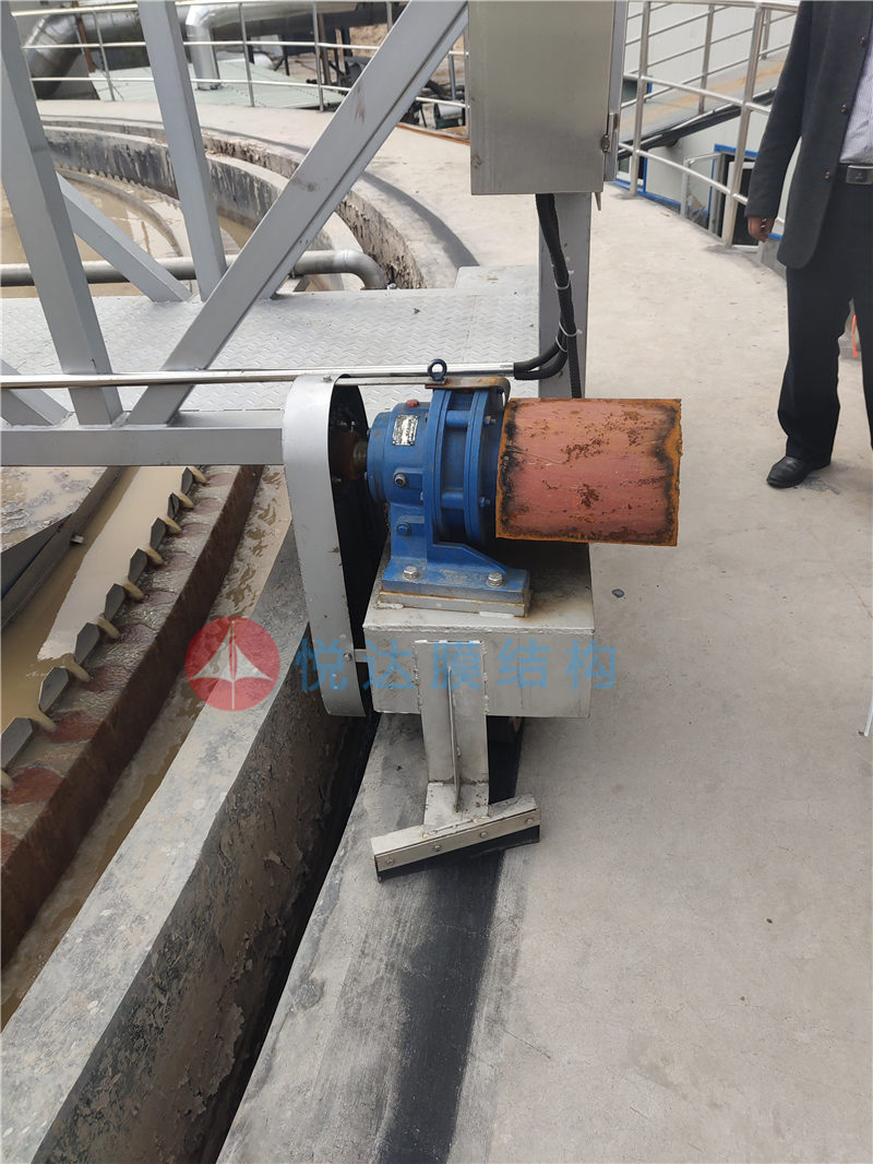 运行成本低。固定式反吊膜密封罩将刮泥机罩在膜内,必须对刮泥机进行进行防爆改造,成本颇高,与此同时,腐蚀气体腐蚀桥架,减少桥架使用寿命。使用随动式反吊膜将刮泥机置于密封罩外,可省去刮泥机改造成本,延长桥架使用年限。