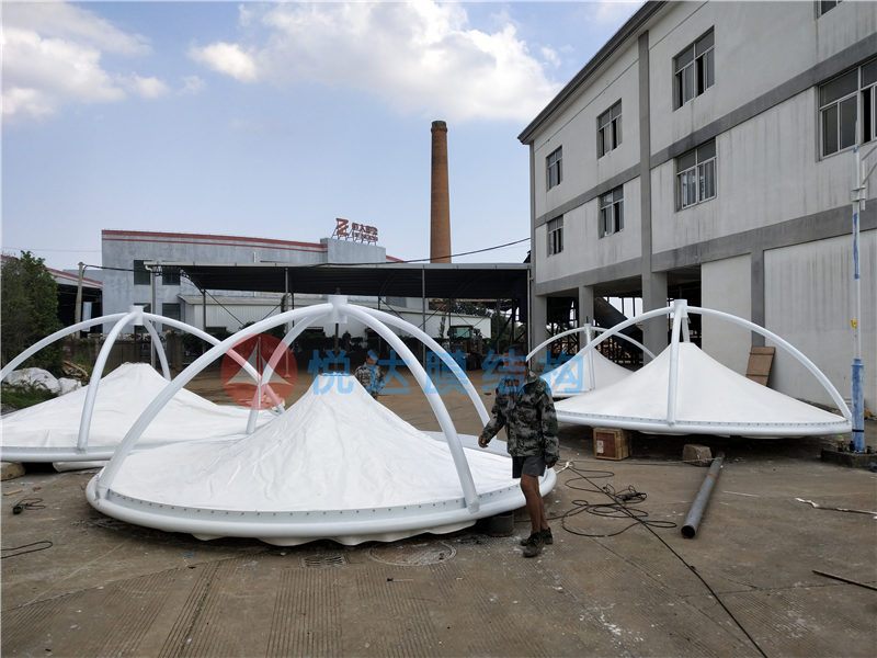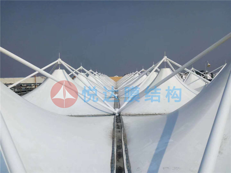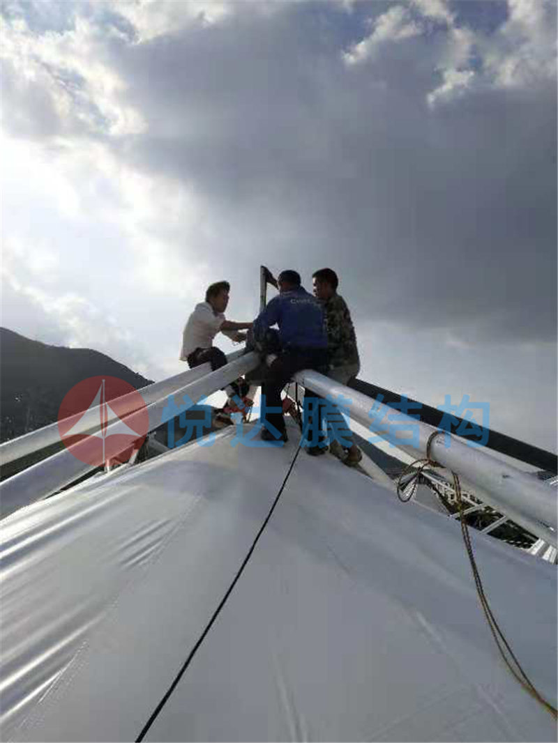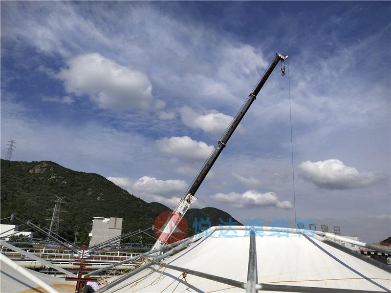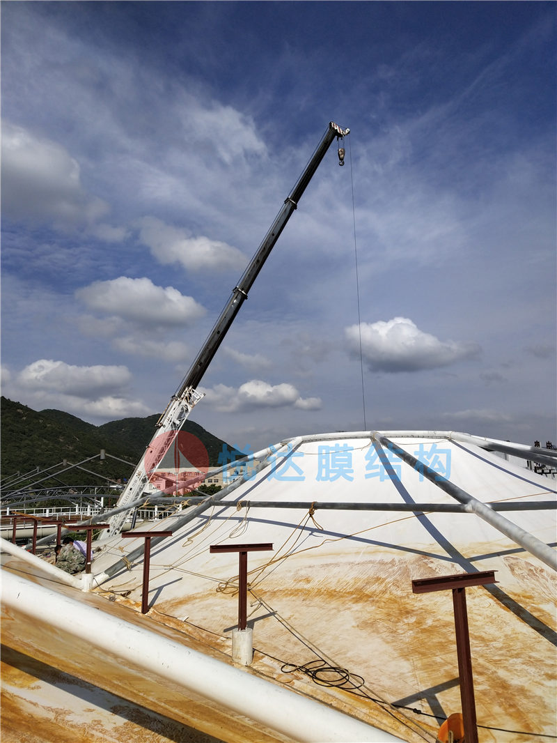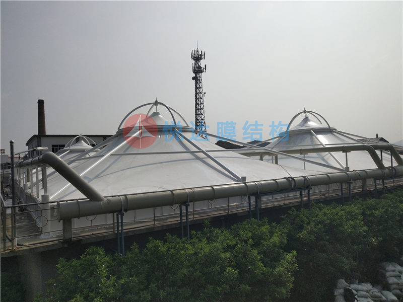 该项目是宁波众茂杭州湾热电废水池加盖膜结构工程,采用加高钢架反吊膜,此方案是常用于污水池加盖密闭的一种膜结构形式,采用的是环境工程专用膜材,钢结构再外面将膜反吊,这样既发挥了膜材的抗腐蚀性,又从根本上解决了钢结构与腐蚀性气体接触而带来的腐蚀问题,因而钢结构可以按普通建筑钢结构的防腐等级考虑进行设计,具有50年的使用寿命,发挥了钢结构的性能,实现了结构骨架与覆盖材料的完美结合。该工程现以竣工,并得到了该业主的一致好评。